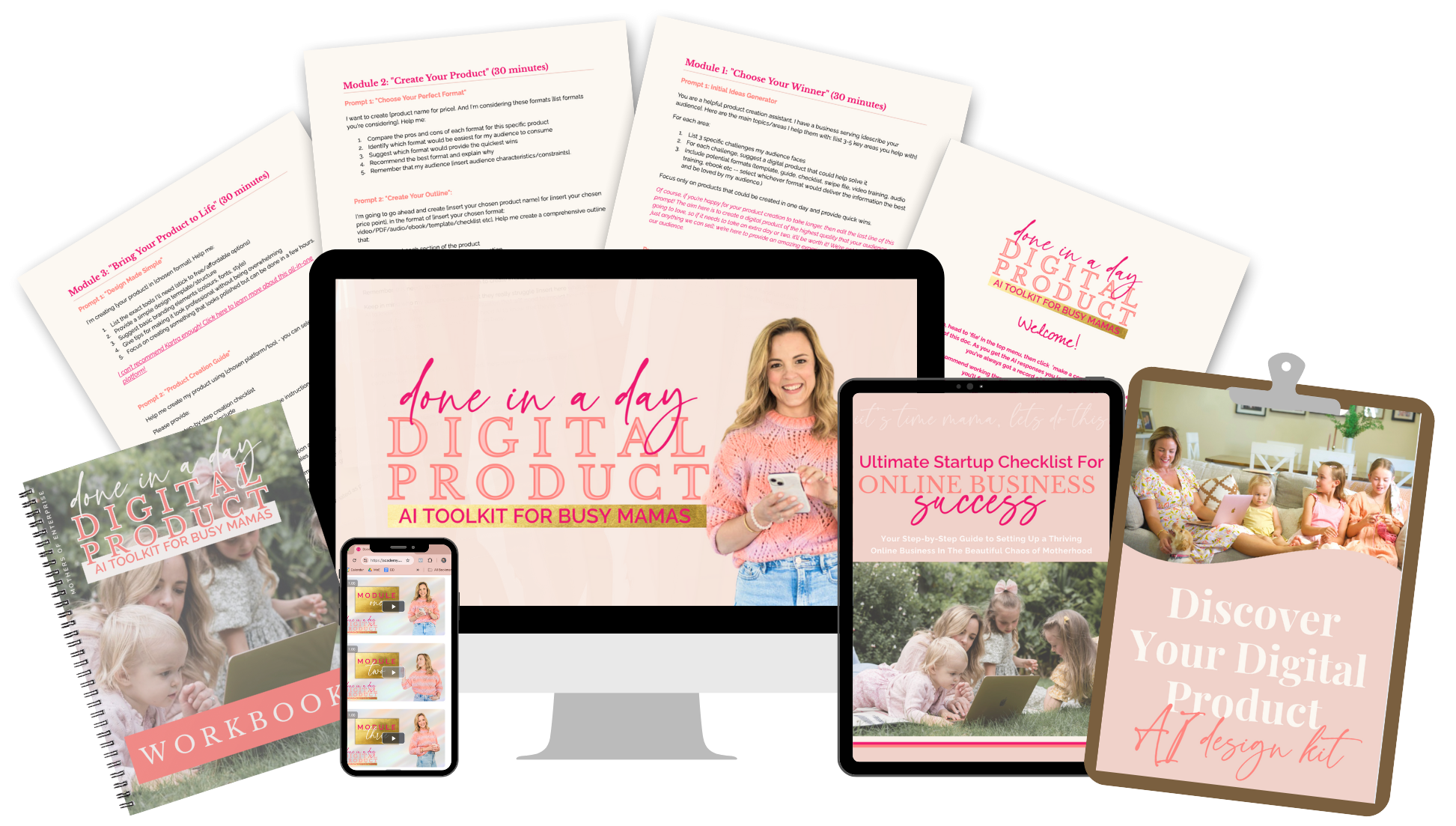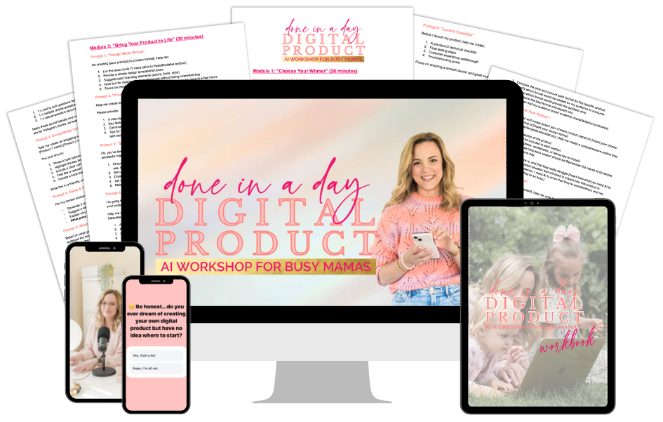 No problem! The workshop starts with a powerful AI prompt to help you brainstorm ideas based on your skills, interests, and what your audience actually wants. You’ll leave with clarity AND a product you’re excited to create. You might also like my FREE Discover Your Digital Product AI Design Kit!